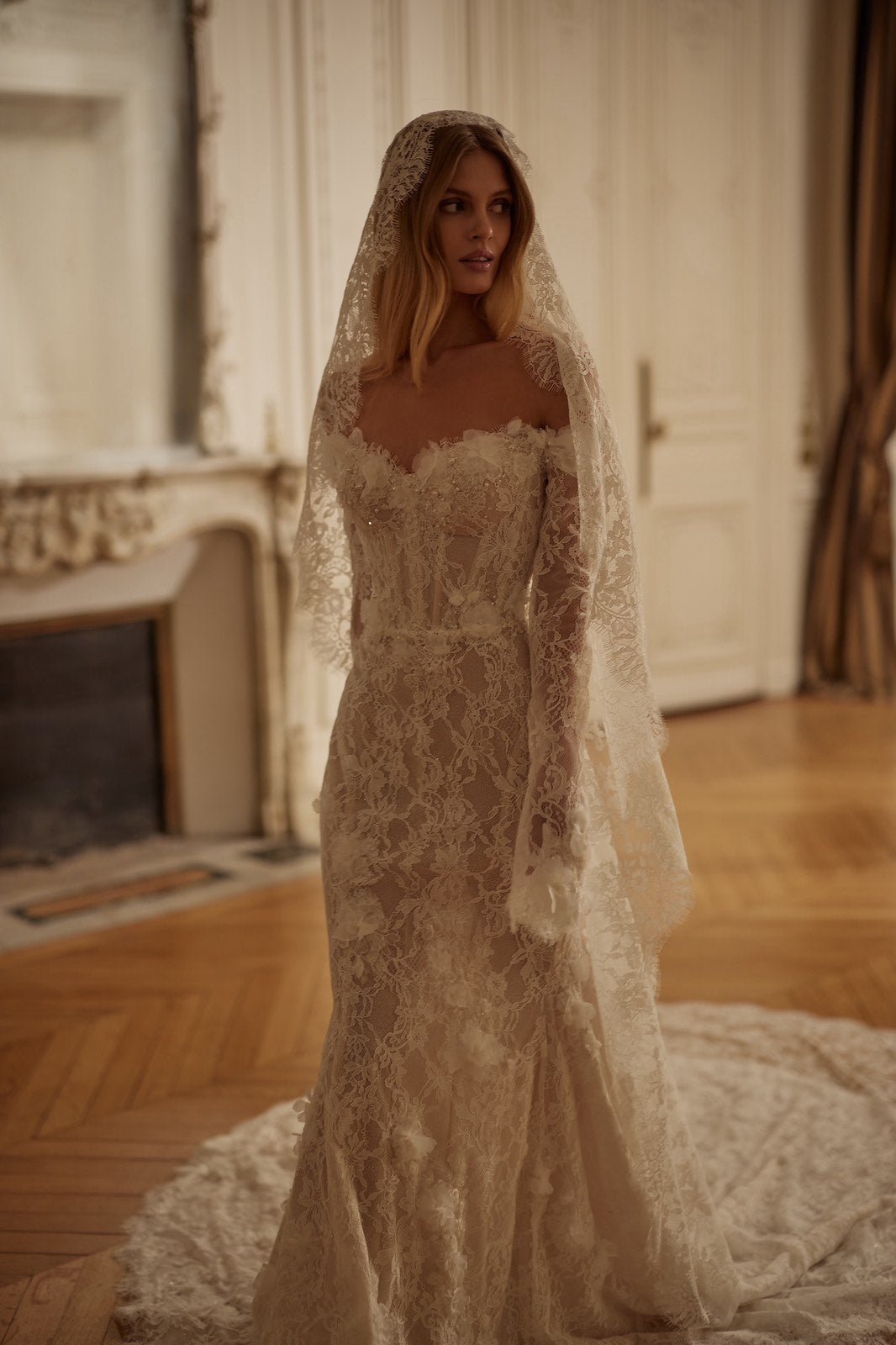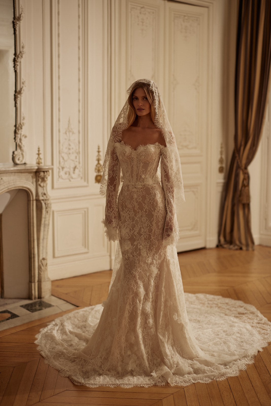 This veil captures the essence of Vintage Romance. Crafted from luxurious lace, it drapes gracefully from head to train with a delicately scalloped border that frames the bride’s silhouette. Perfect for complementing lace gowns or adding texture to minimalist styles, this timeless piece brings grace, tradition, and sophistication to your wedding look.