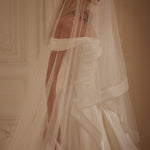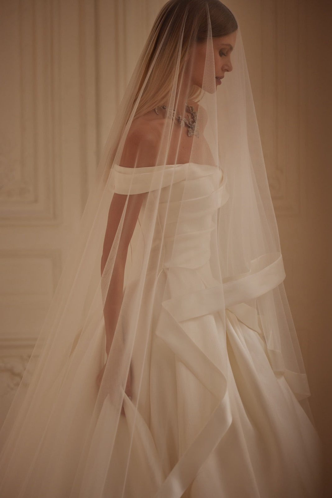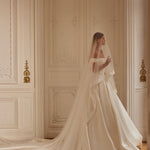This breathtaking cathedral-length veil is the epitome of Timeless Elegance. Crafted from airy, lightweight tulle, it cascades effortlessly to the floor, creating a dramatic yet graceful statement. Its simple, raw edge makes it the perfect complement to both classic and modern bridal gowns, enhancing your look without overpowering it.